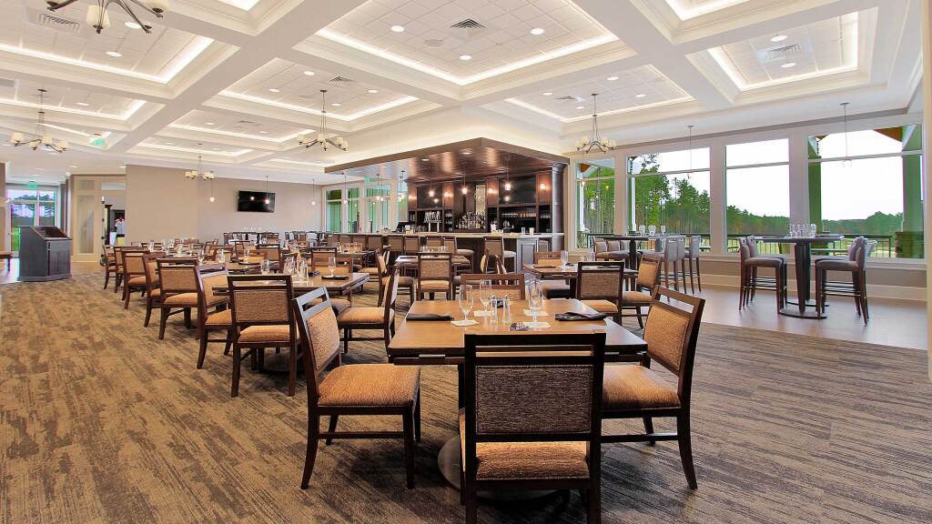 Our private dining room adjacent to The Grille with large windows showcasing the golf course views. This flexible space can be set up to accommodate any intimate group or event.